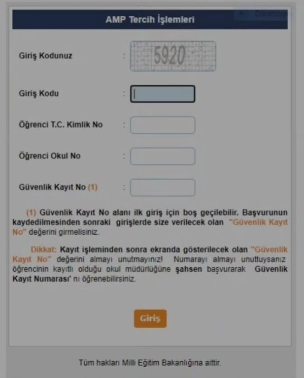 Tıkladığımızda açılan sayfaya giriş kodunu, T.C. kimlik numaramızı yazıp giriş kısmını tıklıyoruz. İlk girişte “Güvenlik Kayıt No” kısmı boş geçilecek.