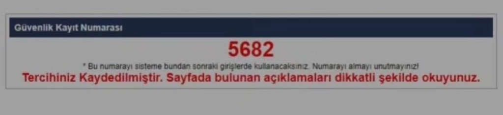 Kaydet butonuna tıkladıktan sonra aşağıdaki gibi çıkan güvenlik kayıt numarasını saklayınız. Eğer güvenli numarasını kaybederseniz okuldan isteyebilirsiniz. Kayıt işleminden sonra onay işlemi okul idaresi yapacaktır. Bu aşamadan sonra tercih işleminiz tamamlanmıştır.