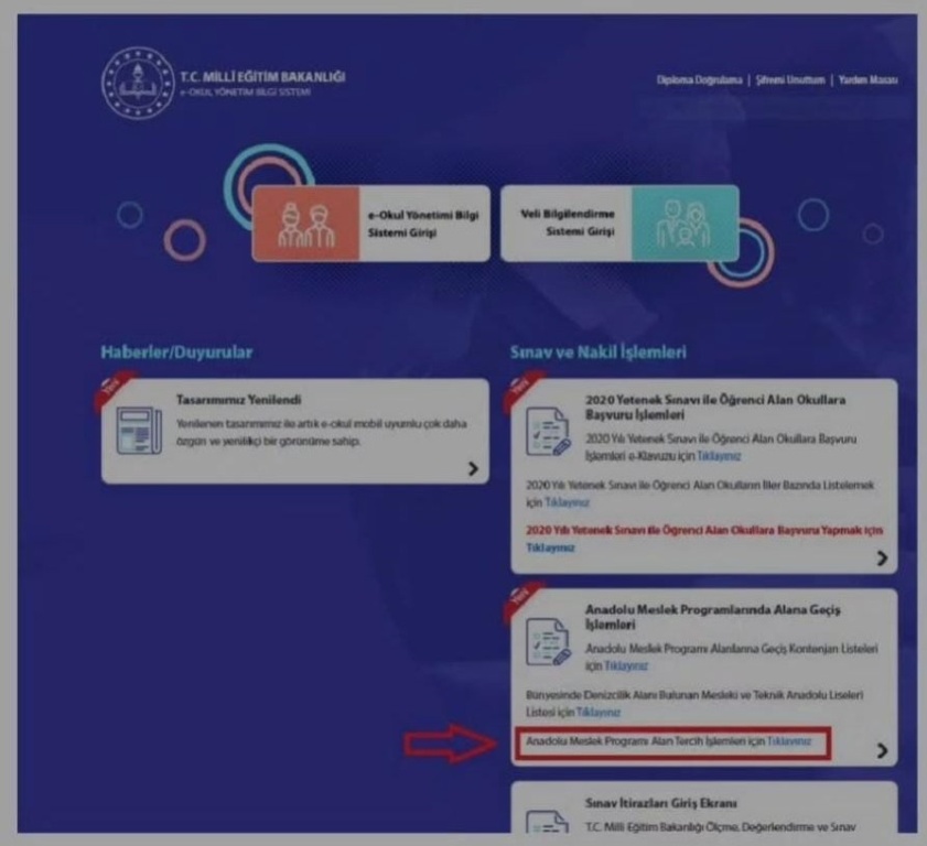 Anasayfada “Anadolu Meslek Programlarında Alana Geçiş İşlemleri” başlığı altında bulunan “Anadolu Meslek Programı Alan Tercihleri İşlemleri İçin Tıklayınız” kısmını tıklıyoruz. (Aşağıda resimde okla gösterilen kısmı)